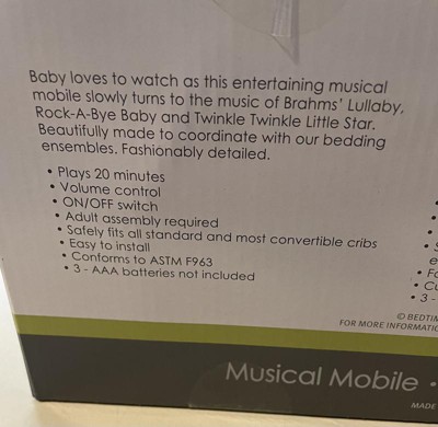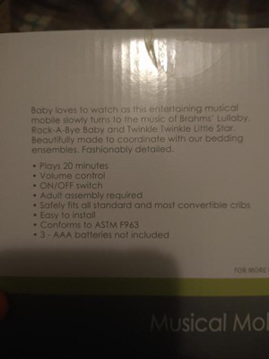 [This review was collected as part of a promotion.] This mobile works great and looks so cute in our nursery. The little animals are soft and matches great with lots of decor. The music has a volume control so thats great and it plays 3 different songs. It plays for 20 minutes and shuts off.