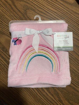 [This review was collected as part of a promotion.] Rainbow jungle baby blanket is so soft and its a pretty light pink color..my 17 month old loves this blanket..it has a very pretty picture of a butterfly and a rainbow on one corner on the blanket....