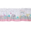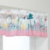 Add a finishing touch to your child’s room with this colorful Rainbow Jungle window valance. It features our cute gray elephant with pink ears, a friendly yellow leopard, pretty lavender peacocks, arched rainbows, trees, butterflies, flowers, and leaves. It is 54” long and 10” high with a rod pocket for easy hanging. And…it is washable for easy care.
