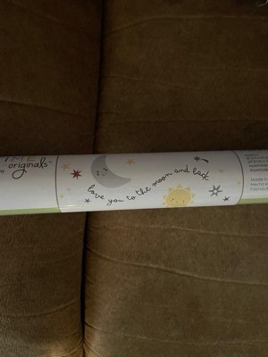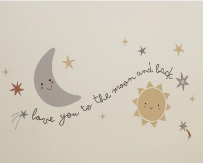 - Features a smiling moon, sun, stars and the words “love you to the moon and back”
