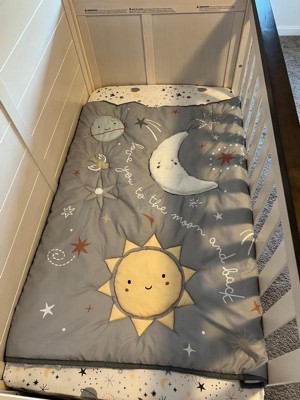 [This review was collected as part of a promotion.] This crib bedding set is so cute. I love how soft is the quilt. I’m using this for my baby’s tummy time and I like it so much so far. The pictures and phrase make the quilt even cuter. Also the fitted crib sheet is perfect for the mattress and the crib skirt is a plus for the decoration.