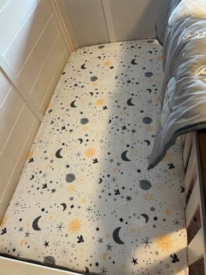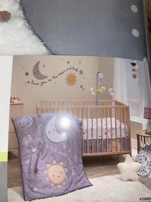 - The decorative crib skirt features happy crescent moons, cute yellow suns, and multi-color stars