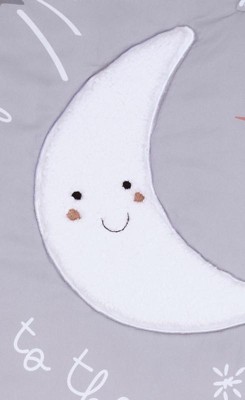 Bedtime Originals Little Star three-piece baby bedding set will create a nursery that’s truly out of this world. The three-piece set includes one quilt, one fitted crib sheet and one crib skirt. The quilt has an expertly appliqued crescent moon in soft white faux shearling with an adorable embroidered face. The words “love you to the moon and back” are printed next to the moon. There is a sweet yellow sun, a happy blue planet and shooting stars. This quilt is the perfect size for tummy time with your little one. The microfiber fitted crib sheet is on a clean white background with crescent moons, suns, planets, and stars. There is elastic all the way around ensuring a safe and secure fit on a standard size crib mattress measuring 28” X 52”. The crib skirt adds a designer touch to your child’s crib. The crib skirt features happy white crescent moons, cute yellow suns, and multi-colored stars. This celestial design will ignite your baby’s imagination, with a sense of wonder and curiosity. The microfiber material and soothing colors promote a calming environment that encourages a peaceful sleep for your little one.