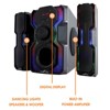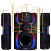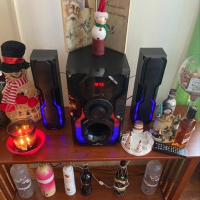 The system includes a main unit sub-woofer with LED lights, as well as 2 LED Lit wired shelf speakers which may be angled to convey the sound to each corner of your musical enjoyment space of choice.