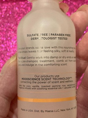 The Ritual: Gently work into damp or dry ends as needed. For a pre-shampoo treatment, comb oil from scalp to ends and indulge in the comforting scent.