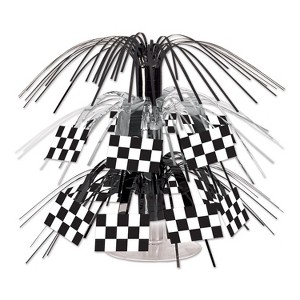 Flag Mini Cascade Centerpiece. The mini cascade centerpiece stands on a plastic platform and is made of shiny black and silver metallic fringe with printed black and white checkered flags. Each centerpiece measures 7 1/2 Inch tall. This mini cascade centerpiece is perfect for any race car celebration! .. Perfect for enhancing any celebration or event. Designed for high-quality, easy use, this product adds instant fun and color to your gathering. Whether for holidays, birthdays, or special events, it provides a festive atmosphere!.