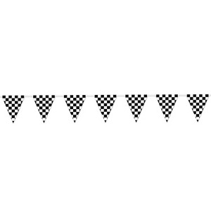 Pennant Banner. Use this pennant banner for your race car party! This is great to hang from the ceiling, porch, patio or fence. It is made of plastic for indoor or outdoor use and has 12 pennants on the string. This banner measures 10 Inch tall by 12 feet wide. The party decor won't be complete without the checkered pennant banner!.. Perfect for enhancing any celebration or event. Designed for high-quality, easy use, this product adds instant fun and color to your gathering. Whether for holidays, birthdays, or special events, it provides a festive atmosphere!.