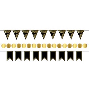 Each foil mini streamer kit can make 3 different streamers. They are made of black and gold cardstock paper with foil on 1 side. The pennants range in size from 2 inches to 6 inches. An 18 foot long black cord is included with each set and can be cut into sections to make the different streamers. Assembly is required. Hang these streamers up to decorate for many types of occasions! *** Party Planning Made Fun *** From New Year's Eve Parties, Halloween and Fall Festivities, Bachelorette Parties, Birthday Bashes, Graduation Get-Togethers, Baby Showers, Pool Parties, and more, our Novelty Items and Party Supplies are sure to add a pop of color and extra spice to any occasion. Celebrating life's events, one party at a time. Since 1900 our mission has remained the same: Create products using the finest materials and to the highest standards. Our customers, products, and employees make us who we are. We are The Beistle Company!