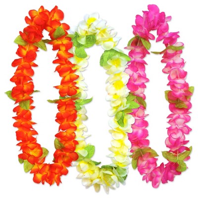 floral leis. The package contains 8 Floral leis in assorted colors. You will receive 2 of each Color , blue with white, cerise with white, pink with white and orange with Yellow. Each one measures 34. 5 inches. They are made of polyester fabric petals. Wear these fun leis to a luau!. Perfect for enhancing any celebration or event. Designed for high-quality, easy use, this product adds instant fun and color to your gathering. Whether for holidays, birthdays, or special events, it provides a festive atmosphere!.