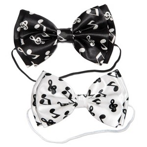 The package contains 4 bow ties. You will receive 2 black bow ties with white notes and 2 white bow ties with black notes. They are made of fabric and have elastics attached. One size fits most. Each bow tie measures 3 inches long by 5 inches wide. Wear these fun bow ties for a music themed party!. Perfect for enhancing any celebration or event.