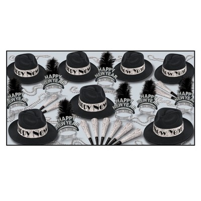 Proudly made in the USA. Simple and classic describes this New Year's kit. Designed for 10 people, this kit includes 5 Gray Top,Hats with foil Black and Silver "Happy New Year" band, 5 Black and Silver Tiaras with fringe, 10 Silver foil horns and 5 bead necklaces. Note: Assortment componets may vary, package not labeled for retail sale. Make this NYE a night to remember with these classic party favors!