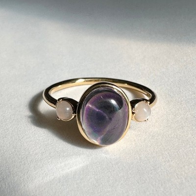 A dreamy mood ring set with an oval color changing mood stone in between two moonstones. This is our grown up version of the classic mood ring with a whimsical vibe. Gorgeous and when worn solo or the perfect compliment when stacked with multiple rings. Mood stone measures 10mm tall.