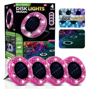 Enhance your outdoor spaces with the Bell + Howell 4-Pack 6 LED Round Fuchsia Mosaic Solar Powered Disk Lights. Each light features a stunning mosaic glass top and six super-bright LEDs, providing up to 10 hours of illumination. These water-resistant, solar-powered lights automatically turn on at dusk and off at dawn, making them perfect for gardens, pathways, patios, and more. Easy to install with no wiring required, they add both beauty and functionality to your landscape.