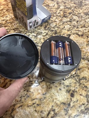 [This review was collected as part of a promotion.] This is the perfect size lantern to take a long camping or even for the kids when we travel at night. Portable and convenient. Very bright led light that is light enough to take with us anywhere. Self containing, it pops up/down for storage and even has a small little fan attached to help cool you down! Can be used as a light, fan or both simultaneously. Requires 3 AA batteries ( not included)