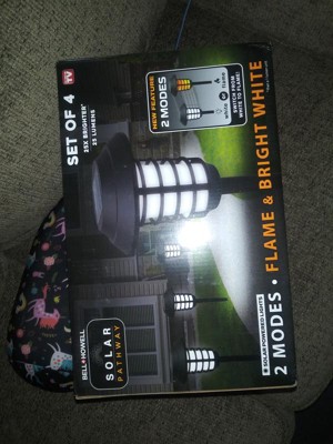 [This review was collected as part of a promotion.] I love how bright these Bell+Howell Solar Pathway lights are! Made from sturdy, durable black plastic, this set comes with four large and bright lights. They are so simple to install: just insert stake into ground and top with the lantern portion. Solar powered, so the sun does the work for you! There are two light settings available to choose from by changing a switch, either a simple bright white or a flickering orange "flame" mode. They were the perfect addition to my front walk to brightly light the path. I will be using these on white, but will definitely be switching them to the "flame" effect for Halloween! Such fun! Definitely recommend!