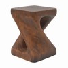 - This attractive side table is uniquely shaped with a twisted spiral with a hollow interior. The surface has been treated to imitate a wood grain. These characterizing features make it both artistic and natural. The texture of the surface on each side table is distinct, which makes them each unique.