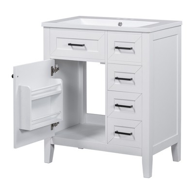 - Considering the humid environment in bathroom, this bathroom vanity has ample enclosed storage spaces: One cabinet with two doors and three drawers with slide rail (the top two drawers are for decoration use only). You can put soaps, towels, shampoos, tissue paper and other bathroom essentials in it so to keep them away from dust. All in all, the reasonable distribution of the whole furniture offer variety functions to meet the different requirements in daily li