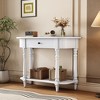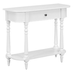 - Our console table has the handy storage and smooth finish that make it right at home in any coastal farmhouse entryway, which captures the essence of vintage style with its harmonious blend of elegance and practicality. Looks aside, it has a top drawer and an open shelf that are just right for holding storage baskets and miscellaneous things. Plus, its long, thin design sits flush to your wall, so it fits in even narrow hallways.