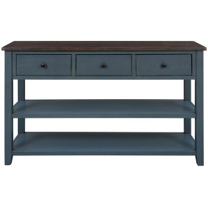 - There are 3 drawers set under the tabletop to offer large room for storing daily necessities or files, and so on. You can keep daily sundries out of your sight to ensure your home clean and tidy. Round retro handles with fine craftsmanship shows a delicate and elegant life attitude. As a practical console table, the open style shelf is a vital element. The setting of 2 open shelves meet the requirements of placing storage basket, books, pot culture, etc.