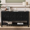 - Featuring cabinet doors adorned with intricate polygonal designs, this entryway table adds a touch of artistic sophistication. The geometric motifs create visual intrigue, making it a stylish centerpiece for any space.