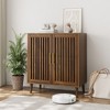 - This walnut storage cabinet combines rustic farmhouse charm with modern elegance, featuring unique slatted doors that create a striking focal point in any room. Its versatile design effortlessly complements dining rooms, living rooms, offices, or kitchens, adding both functionality and aesthetic appeal to your home