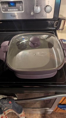 Part of the bella Fits-anywhere™ kitchenware system, the Make & Take Electric Skillet has an inverted lid design that locks in place so you can store the skillet on its side to maximize storage space. The large squared skillet is 3” deep, making it great for cooking chili, casseroles and other potluck favorites. It has a robust cast aluminum base for consistent, even heating. The sturdy clamps hold the lid securely, making it easy to transport.