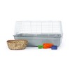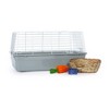 Prevue Pet Products Bella cage kit is ideal for guinea pigs and rabbits. It features and all-welded mesh with 1" wire spacing, and a large top-opening door. The deep base has a built-in angled hayrack. Snap-off end clips hold the mesh securing in place and remove easily for cleaning. Kit includes a ceramic food bowl, carrot chew toy and woven pet basket. Just add food, bedding and, of course a furry friend!