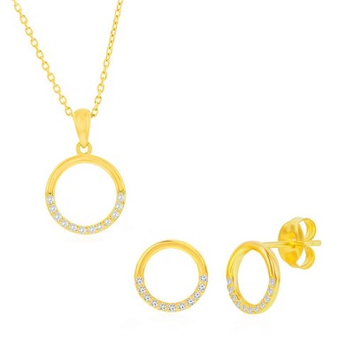Bella Silver Sterling Silver, Pave CZ Oval-Shaped Necklace & Earrings Set - Gold Plated - Gold - 16+2 Inch