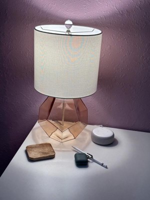 [This review was collected as part of a promotion.] 510 Design Bell Geometric Glass Table Lamp is really now the prettiest lamp I own. I plan on getting compliment's on it from everyone I let in my home. I put it near the window and it gets light that shines on it through the transparent pink glass globe on the bottom.It stands out beautifully. The white shade is a good contrast color to the lamp as well. This little lamp gives just enough light in the evening for reading a book or watching a movie. It is small enough to sit on an end table with additional room for other items, permanent or temporary. The geometric shape of the glass bottom is what makes this lamp so unique and fun. I am really loving it!