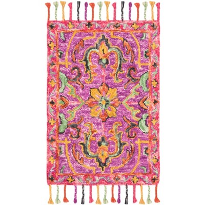 The colors and quality are exactly what I would expect from a Safavieh rug. This is a plush, wool rug with a think pile. The fibers are dense and it have a luxurious feel when walking on it. There was no smell as I have experienced with other wool rugs. The colors are vibrant and rich and the pattern is so pretty. I feel the colors are close to what you see on screen but the pink is definitely toned down and in person. I was nervous it would be on the garish side for color but it is truly a beautiful color combination.