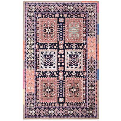 The centerpiece of the design is a deep navy background, setting off the intricate and symmetrical pattern inspired by traditional motifs. Surrounded by a harmonious blend of floral patterns in shades of red, pink, and ivory, this rug exudes a timeless allure. The border boasts complementary floral elements creating a frame that enhances the overall aesthetic.
