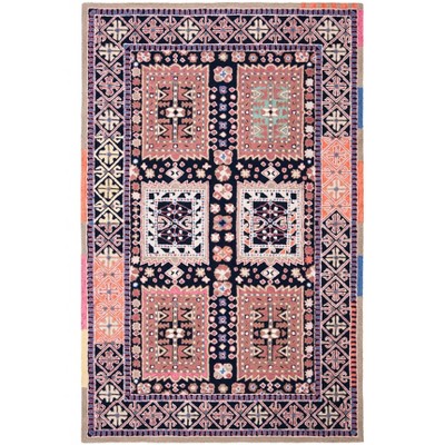 Indulge in the deep hues and striking details of our Navy Blue/Multi-Colored Medium Rectangle Area Rug. Expertly hand-tufted in India, this beautiful piece showcases exemplary craftsmanship and exceptional wool quality. Sized conveniently at 5' x 8', it features a plush pile height of 3/8", creating a soft, luxurious underfoot experience.