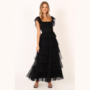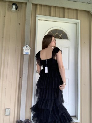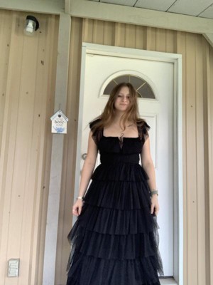 Be the belle of the ball in this stunning tulle maxi dress! Featuring a square neckline with tie close, thin elasticised straps with ruffle detail and a front cut out on the bust, this dress is sure to turn heads.