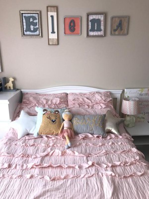 I love the look of this quilt. The ruffles are so girly and perfect for my little girls room. I just wish they would of sewn down the bigger ruffles because you have to arrange them so they sit nicely, but that doesn't bother me it only takes a few seconds and so worth the end result which is just like the picture. Unfortunately, I did notice ink spots in a few places around the quilt so I will be exchanging ASAP!