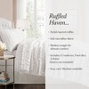 This comforter looks so pretty on the bed but the ruffles are so scratchy and itchy that if you ever plan on sitting on top of your bed then this won’t work at all. The edges of the ruffles have been coated/heated to prevent fraying, making them extremely scratchy. Unfortunately this didn’t work for us since we sit on top of our bed frequently. Other than that, the comforter is very plush, full, and heavy. Seems very warm and perfect for winter. The ivory is also a beautiful color and not too yellow- just perfect.
