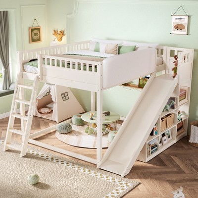 The Queen Size Loft Bed is a stylish and functional piece that combines comfort, storage, and play in one design. With a soft upholstered headboard, built-in storage shelves, and a fun slide, this bed is perfect for kids. The solid wood frame ensures durability, while the space-saving design makes it ideal for smaller rooms. The neutral natural color complements various bedroom styles, providing both practicality and charm for any space.Please note: This item ships in 2 separate packages.