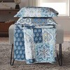 - Beautiful floral-inspired quilt in soothing blue, lilac, navy, white, and green tones to brighten any bedroom