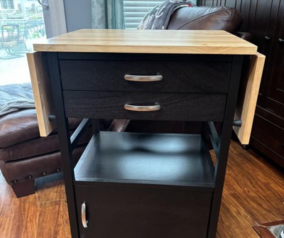Add instant counter space and storage to your kitchen with the Bellini Kitchen Cart. And wheel the handsome, two-toned cart into the living room or the patio for entertaining. The double drop leaves provide extra surface space (up to 43"W) to prepare meals or serve hors-doevres. Plenty of room for ice, bottles of wine, glassware and serving plates. The cart features two drawers for kitchen or bar accessories, an open shelf, and a lower cabinet for additional storage. The drawers and cabinet are finished with quietly curved handles in satin nickel. The cart rolls easily on professional grade casters, two of which are locking to keep the unit stable while in use. Finished in a new, rich Coffee with a Natural wood top, the cart is made of Solid and Composite Wood for enduring good looks and integrity.