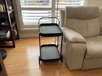 I am very pleased with my purchase. I am using the carts as side tables in my living room. I plan to add a couple of small plants to the table closest to our floor to ceiling windows - the wheels will allow me to easily move it back and forth to the window as required. I am using vinyl placemats on the trays - I cut the corners to round them to the shape of the trays. I bought the dark brown/black carts - blends nicely with my other furniture. I assembled the carts by myself - they went together very easily and did not require a second pair of hands.