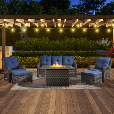 Experience the comfort of this durable and reliable 6-piece patio furniture set. Made of high-quality PE rattan and a sturdy powder-coated steel frame it is built to withstand a variety of weather conditions ensuring years of outdoor enjoyment. The fire pit table is capable of releasing 50000 BTU of heat so you can feel warm even outdoors while keeping your food warm. Whether you're on a balcony lawn garden or poolside this set is perfect for all outdoor spaces.