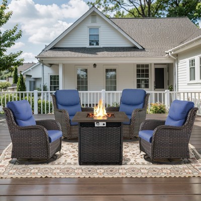 Elevate your outdoor living space with the Belord Patio Furniture Set, featuring 1 propane fire pit table, 4 swivel rocker patio chairs and 2 accent side tables. Designed for both style and function, this set brings comfort and charm to any patio or garden. Each wicker swivel chair comes with a playful "smiley face" back cushion and a plush 4-inch seat cushion, offering the perfect spot to unwind. With smooth 360° rotation, the chairs add an extra touch of convenience and fun. The propane-powered fire pit table delivers clean, smoke-free warmth, making it an eco-friendly centerpiece for cozy evenings and lively gatherings with family and friends.