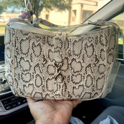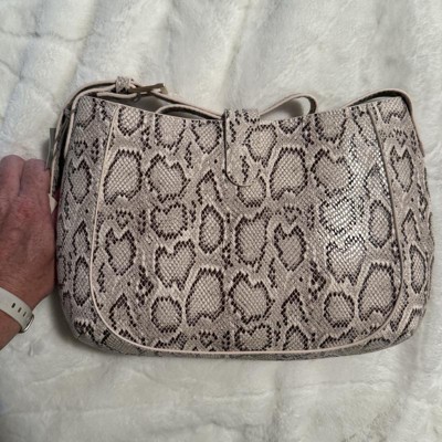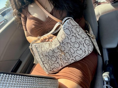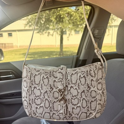 [This review was collected as part of a promotion.] I was attracted to the faux snake print on this bag. I love the beige neutral color that goes with so many outfits. I like the medium size of this chic bag that can tale a purse and phone and glasses. It fastens easily and looks great. It is suitable for all ages and perfect for travelling. The strap is adjustable and it can be worn over the shoulder too and It is made well. I received an incentive to write this review.