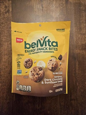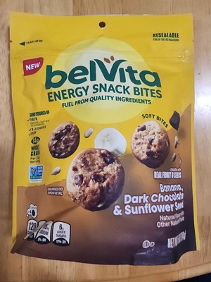 Banana, Dark Chocolate and Sunflower Seed belVita Energy Snack Bites are delicious snacks to help fuel your busy morning. Made with real fruit and seeds, these soft, tasty snack bites have a delightful flavor combination and texture. Each serving (four snack bites) contains 14 grams of whole grain and 4.5 grams of total fat, and belVita Energy Bites are a good source of fiber, iron, and B vitamins. Made from wholesome grains and other quality ingredients, these delicious energy snack bites contain no high fructose corn syrup and no artificial flavors, colors, or sweeteners. They’re also kosher and Non-GMO Project Verified, making them a wonderful alternative to traditional banana nut muffins and chocolate muffins, breakfast snacks, and breakfast bars. Packaged in resealable snack packs that are great for sharing, they make wonderful office snacks, school snacks, and on the go snacks. When you need a snack with fuel from quality ingredients, reach for belVita Energy Snack Bites.
