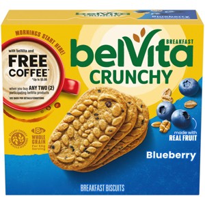 Start your morning off right with lightly sweet and crunchy belVita Blueberry Breakfast Biscuits. These bulk breakfast biscuits combine wholesome grains with fruity blueberry flavor for a delicious breakfast. Specially baked, these baked biscuits contain slow-release carbs that break down gradually in the body to deliver delicious, steady energy all morning long so you can enjoy these with your morning coffee, yogurt and fruit or as an instant breakfast food no matter what the morning brings. Each 50 gram serving of these bulk breakfast cookies contains 18 grams of whole grain, 2 grams of fiber and B vitamins for a delicious alternative to breakfast bars. A simple addition to your morning, these cholesterol-free bulk biscuits for breakfast contain no high-fructose corn syrup and no artificial colors, flavors or sweeteners. What are you waiting for? These convenient breakfast biscuits made with wholesome grains are a great alternative to traditional breakfast snacks. This bulk breakfast food is also an energizing alternative to snack bars and a wholesome addition to college care packages. Each individual pack contains four belVita Blueberry Breakfast Biscuits for you to enjoy on the go, at the office or at home for lasting morning energy.