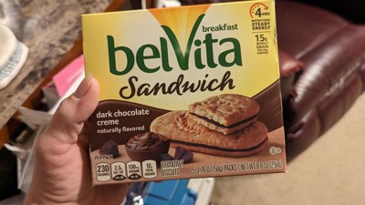 [This review was collected as part of a promotion.] BelVita Sandwich Dark Chocolate Creme Breakfast Biscuits, 5 Packs (2 Sandwiches Per Pack) is perfect for breakfast or a snack on the go. Contains protein and provides sustainable energy for up to 3 hours. The dark chocolate middle helps the sweet tooth craving for chocolate. My kids even like them.