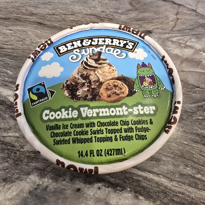 - Ben & Jerry's Cookie Vermont-ster Sundae Vanilla ice cream pint with chocolate chip cookies, chocolate cookie swirls, topped with fudge swirled whipped topping and fudge chips