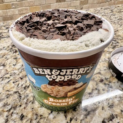 - Ben & Jerry's Bossin' Cream Pie™ Topped Vanilla ice cream pint with Vanilla custard ice cream, cake pieces & pastry swirls topped with milk chocolatey ganache and fudge chips
