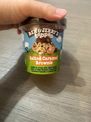 - Ben & Jerry's vanilla ice cream topped off with salted caramel & fudgy brownies is a sundae in a pint. Instead of a cherry we added a thick layer of chocolate ganache on top. All you need is a spoon!