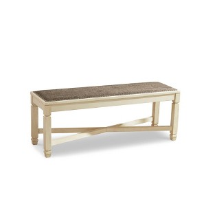 Dine in the rustic charm of this unique bench. The cushioned seat, upholstered in a heavy woven fabric, seats two comfortably. A textured antique white finish coats the rest of the bench creating a vintage two-tone look that will endure for years. Signature Design by Ashley is a registered trademark of Ashley Furniture Industries, Inc.