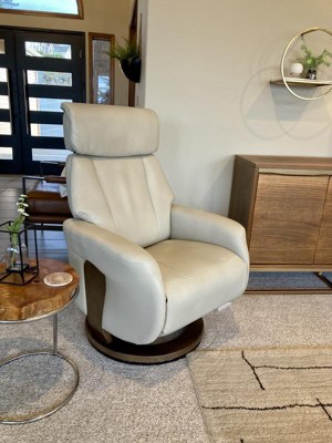 First off, I'm pretty particular so 4 stars is a real "win" for me. I searched and searched for a different chair for myself to use in our living room. I was originally going for an Ekornes Stressless chair and ottoman set, but decided to try a reclining option instead. I had alot of trouble finding a Stressless that fit me well and was comfortable. They were all super low to the ground and not very deep under my knees (and I'm a small woman). I also needed this to have a Scandinavian flair to it in order to match my other furniture. At first, I wasn't wild that it was faux leather, but the photos in other reviews looked like the chair was a decent quality faux leather and didn't have that fake look. So I took a chance and ordered it, and I'm very happy with the purchase. I would not recommend this for a larger person - as I said, I'm small and it's JUST fits my frame (sometimes the width can even feel a bit small for me, but it's not a deal breaker). It's firm, but comfortable, modern but not weird-modern, sophisticated but inviting, and overall estethically pleasing. The headrest can adjust easily up and down, the footrest reclines independently of the backrest, the backrest is released by a "loop" between the seat and armrest so you can recline the back or not whenever the footrest is up. It also swivels very easily when you give it a push. A couple of picky notes are that the wood color is a little drab - very "brown" without much warmth or pop to it. Also, the front view of the bottom half of the chair seems quite a bit more "rounded" and prominent than it looked in the photos (my mind kind of went to an RV swivel chair look....again, not dealbreakers but just an fyi. Also, I felt the $860 price tag was on the high side for faux leather, but I'll chalk that up to inflation. Again, overall this was 98% of what this picky lady was looking for, so I'm happy.